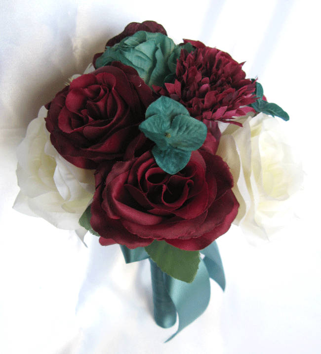 Wedding Bouquet 17 Piece Bridal Bouquet Set Burgundy Eggplant Teal Wedding Flower Bridesmaid Bouquet Package Corsage Rosesanddreams